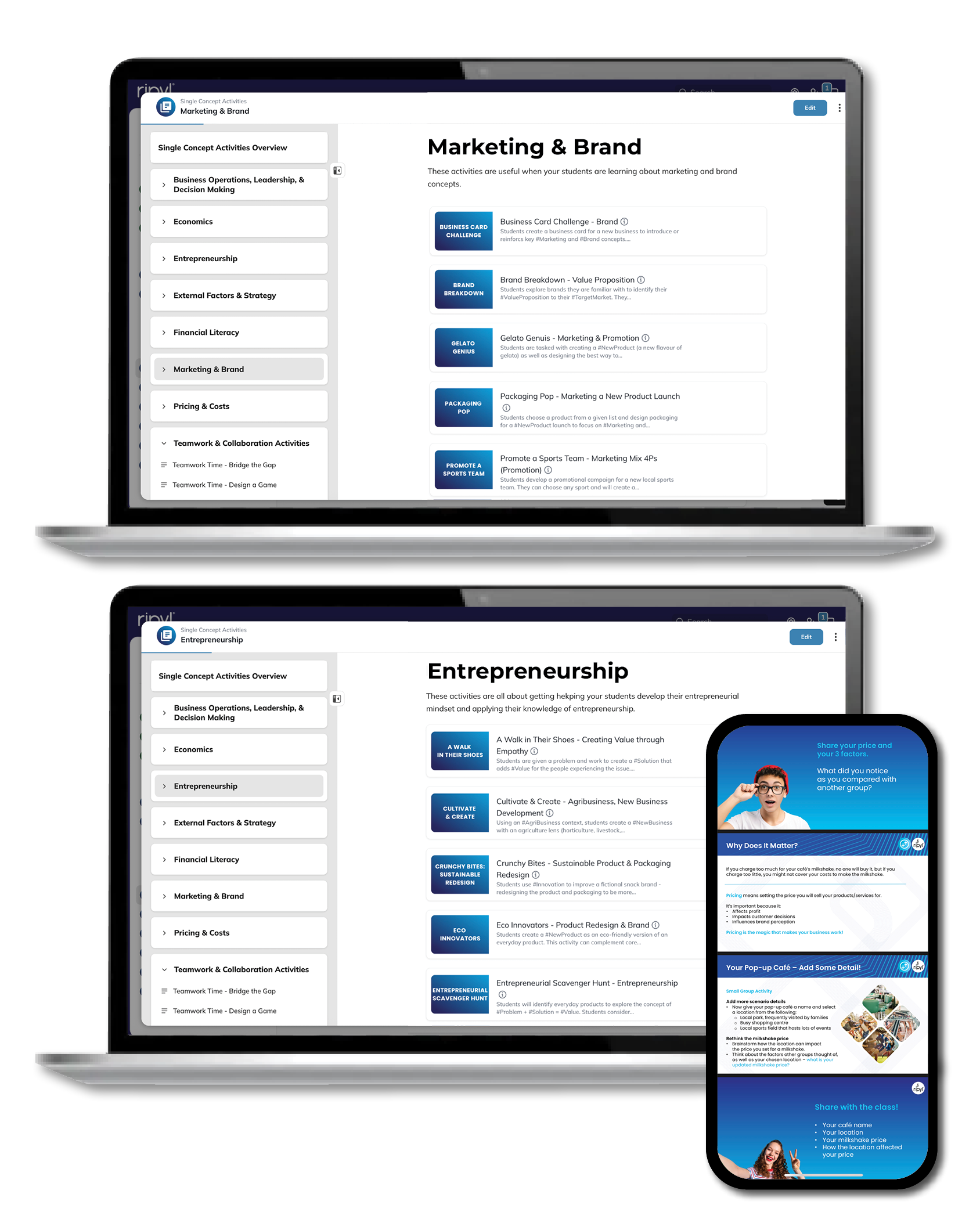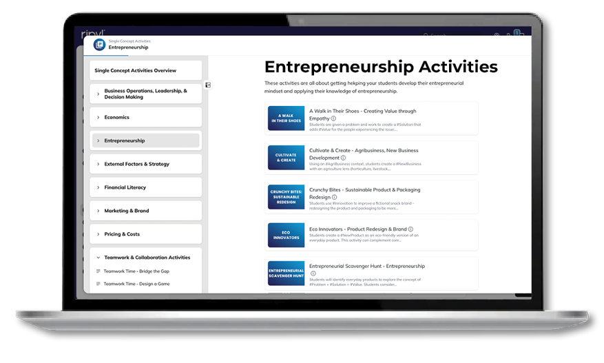 Ripyl® provides high school teachers with ready-to-use classroom activities that help students apply business concepts through relevant brands, relatable examples, and real-world contexts.